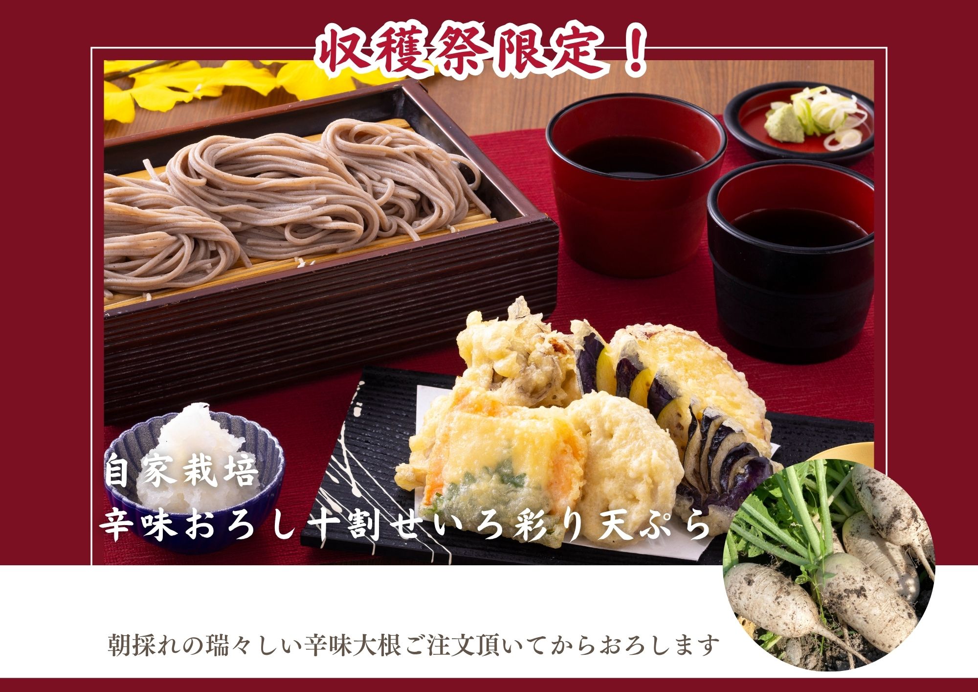 2025.10.14 収穫祭2025 毎年恒例! 新そば収穫祭 10月22日(水)よりスタートします♪ 自家栽培の辛味大根が期間限定で登場! 十割せいろ、更科せいろの追加1枚がそれぞれ税込200円! そして 人気のスイーツ5種が税込200円♪♪ 皆さまのご来店心よりお待ちしております! 前へ 一覧へ